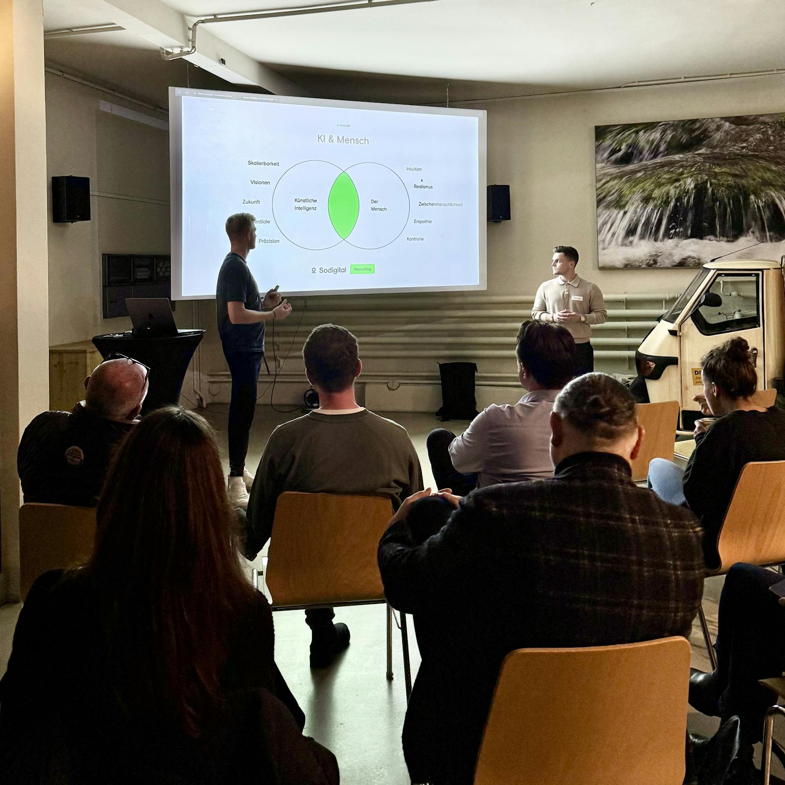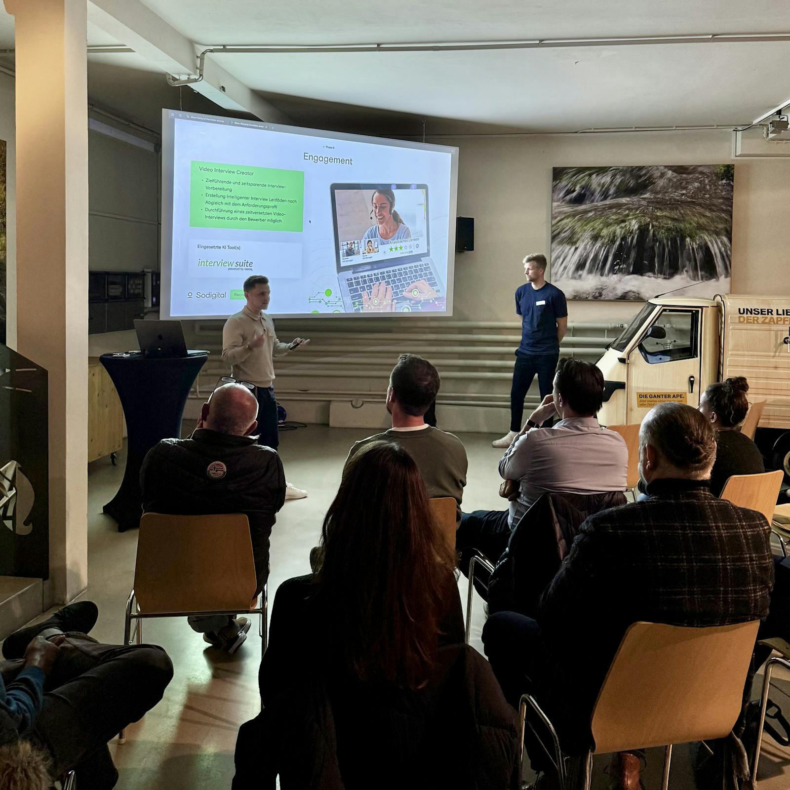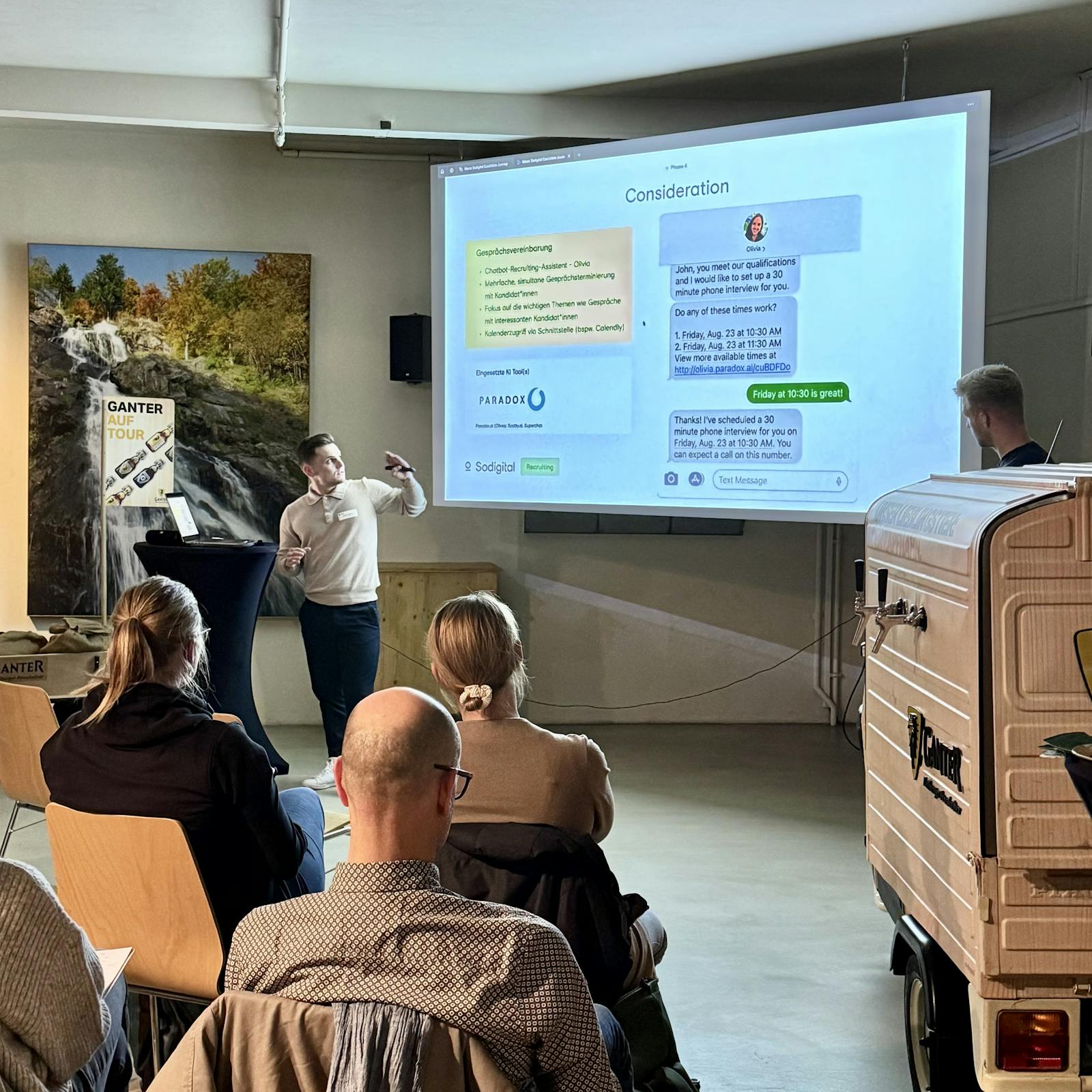 Gemeinsam mit den Experten Marcel Rombach und Tobias Landerer von Sodigital haben die Teilnehmenden einen tiefen Einblick in die Möglichkeiten der KI im Recruiting erhalten. Dabei wurden spannende Ansätze und praktische Anwendungen vorgestellt: