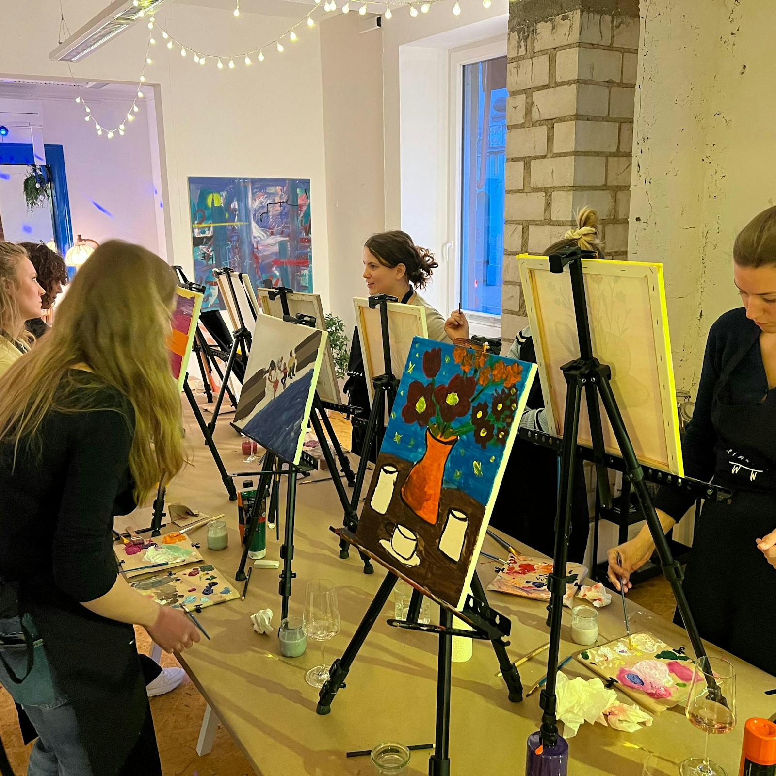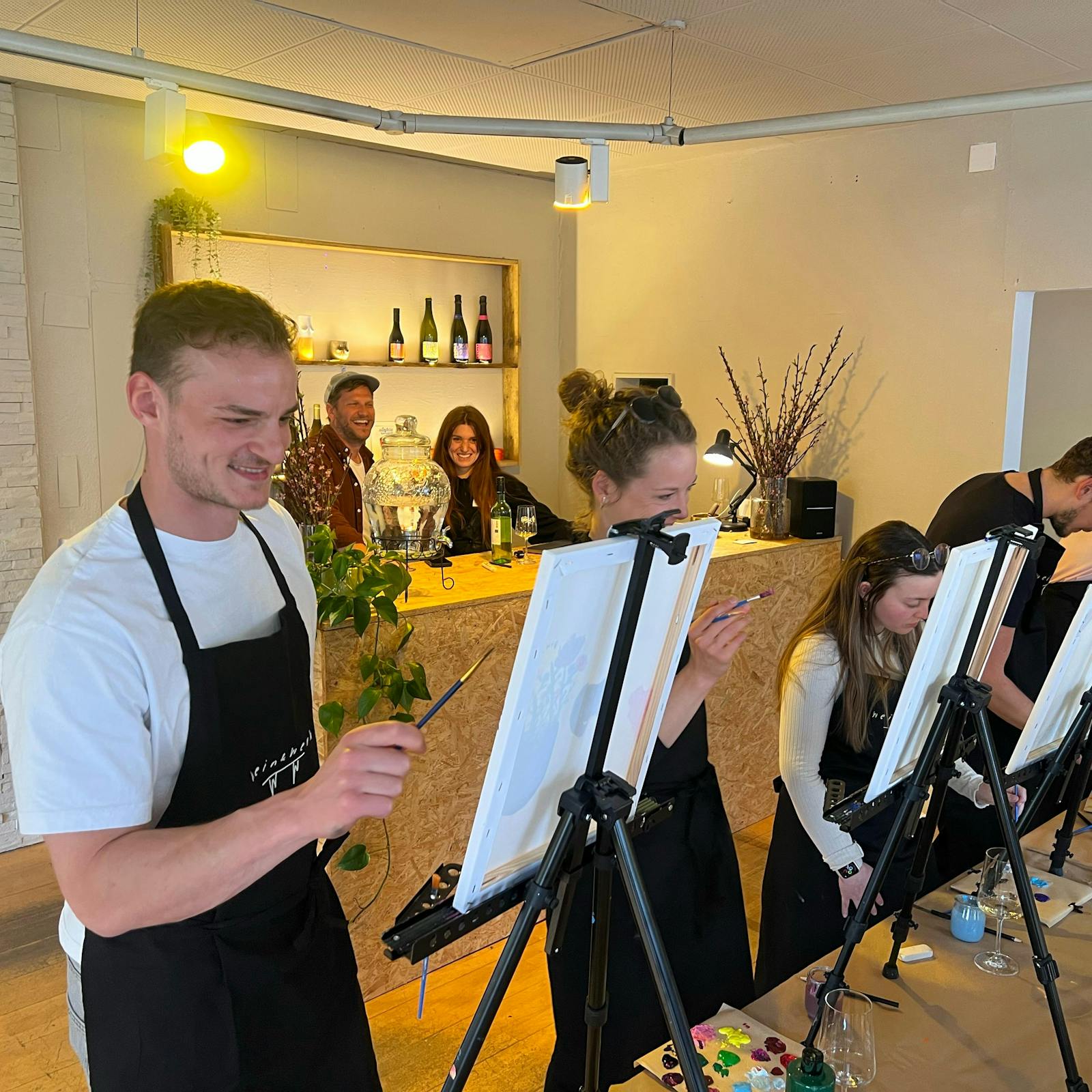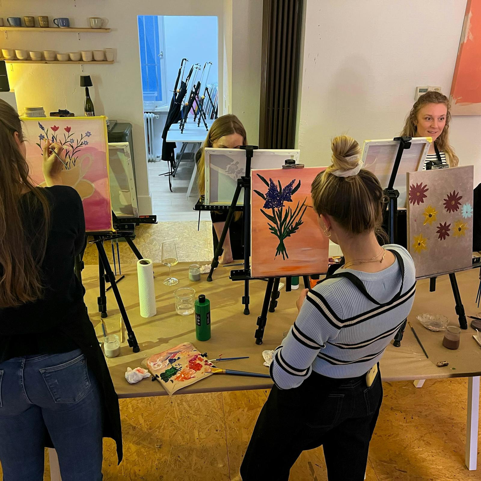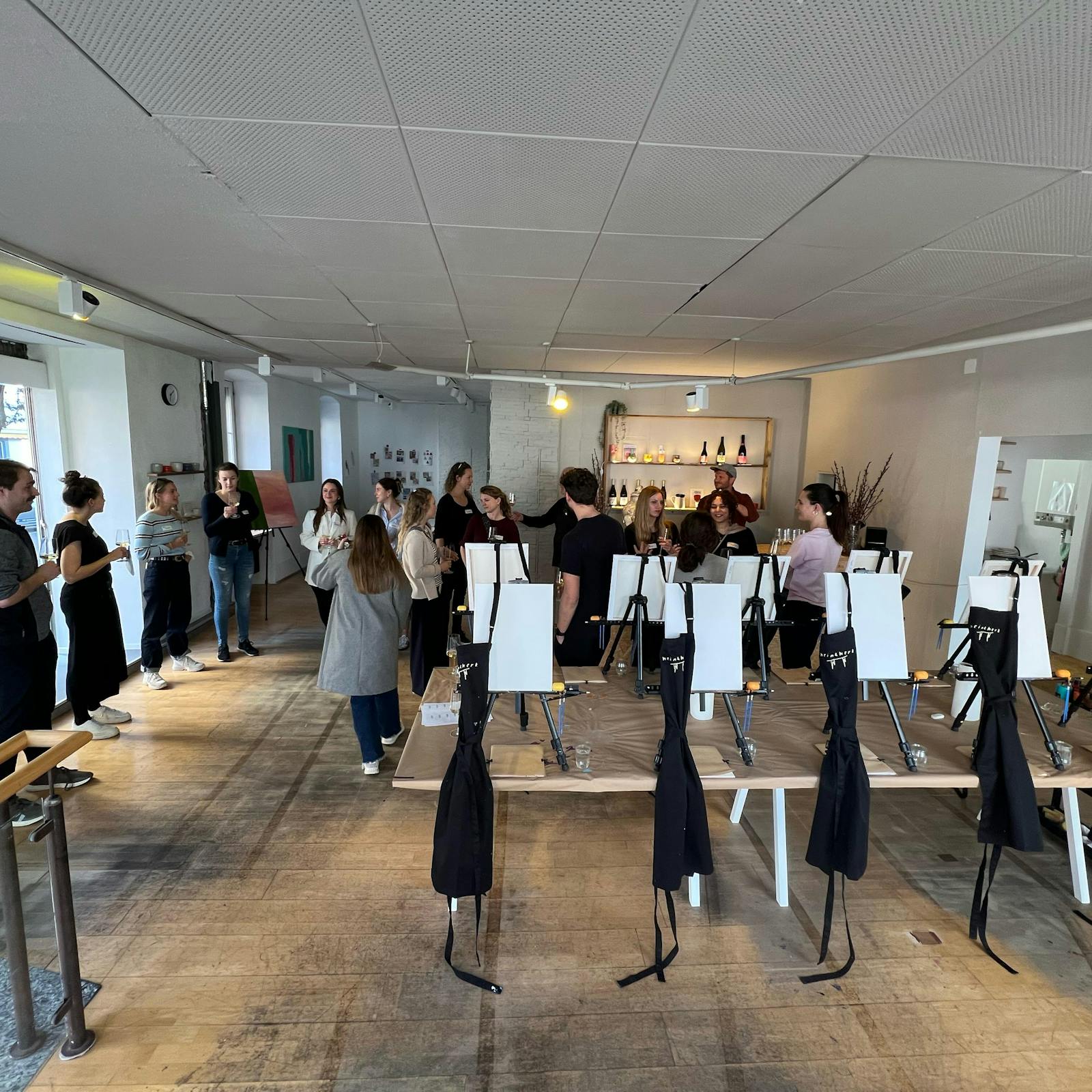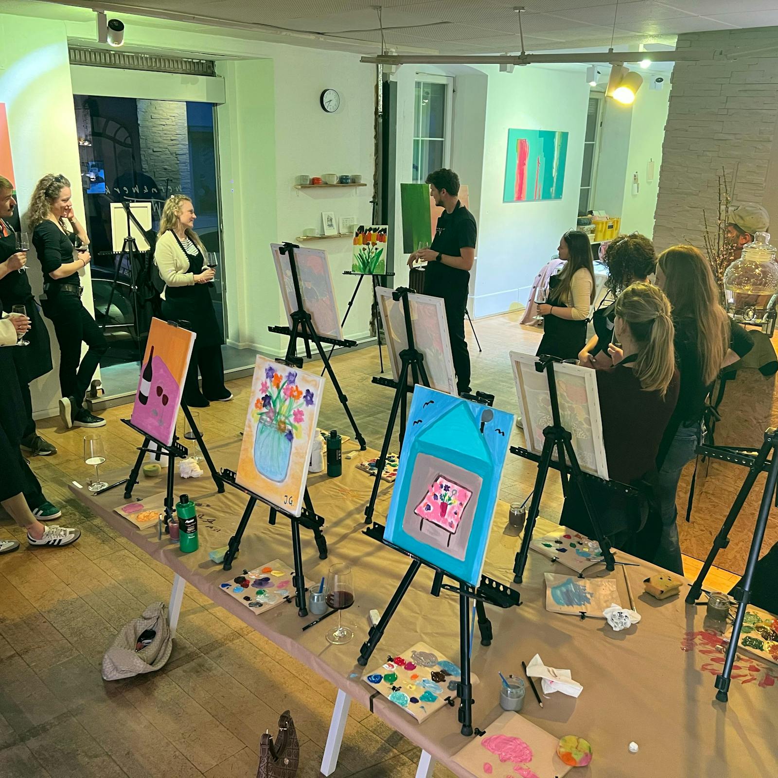 Bei Wein und Käse konnten die Teilnehmenden ihrer Kreativität freien Lauf lassen. Passend zu den zugelosten Stichworten „Kaffee“, „Zeit mit Freunden“ und „Blumen“ entstanden persönliche Kunstwerke auf Leinwand. Ein Abend voller Inspiration, Austausch und kreativer Entfaltung.