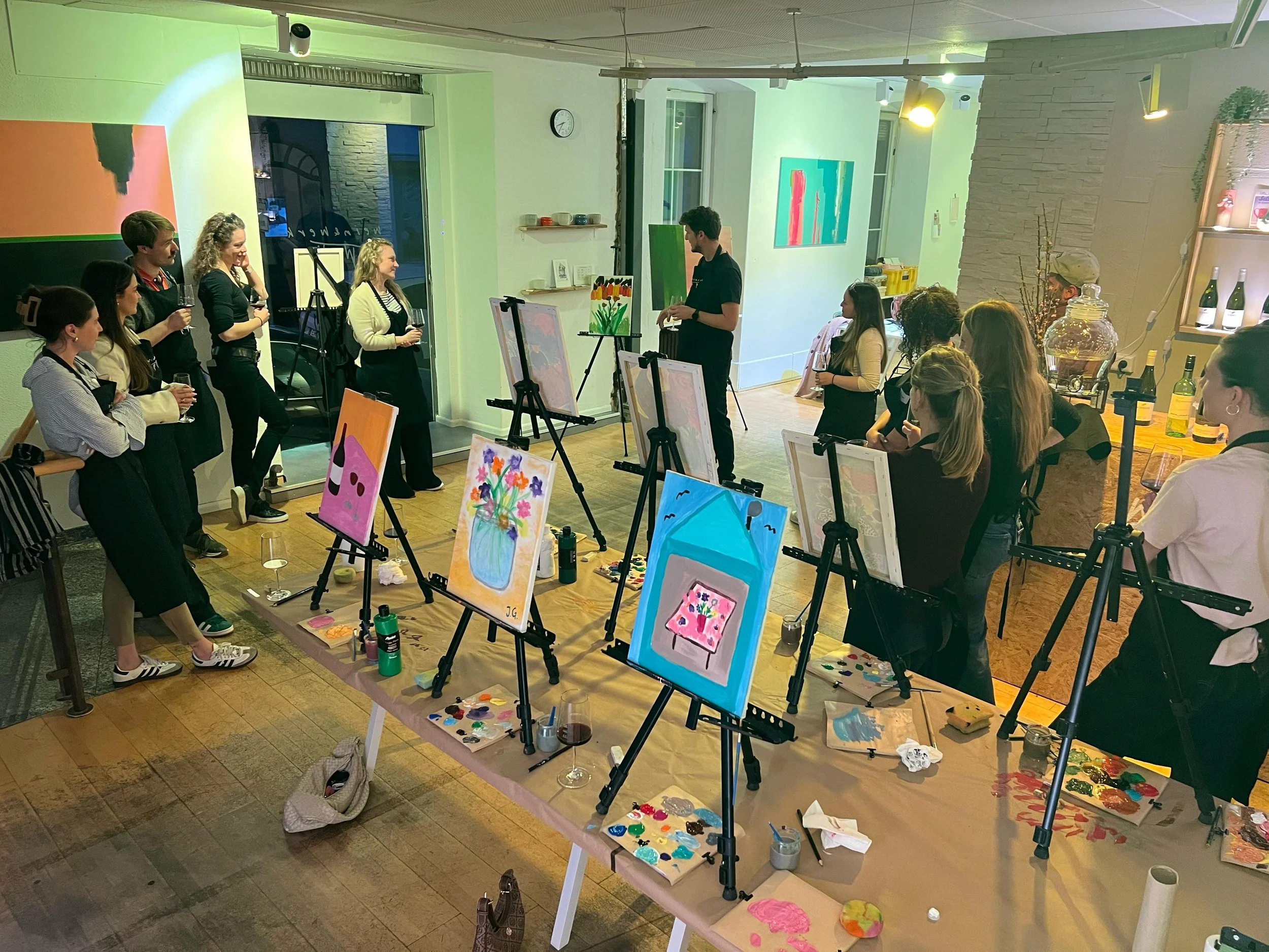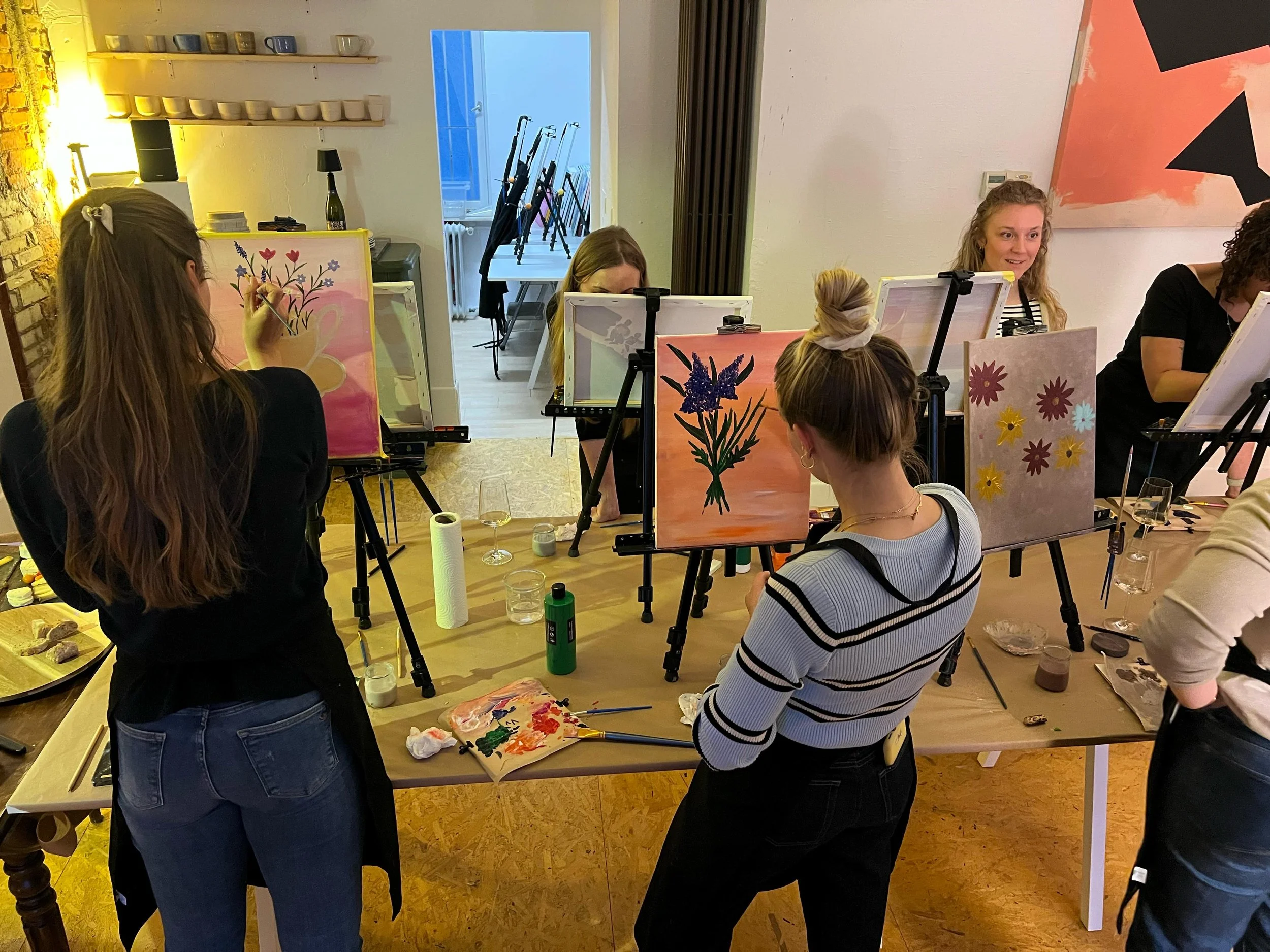 Bei Wein und Käse konnten die Teilnehmenden ihrer Kreativität freien Lauf lassen. Passend zu den zugelosten Stichworten „Kaffee“, „Zeit mit Freunden“ und „Blumen“ entstanden persönliche Kunstwerke auf Leinwand. Ein Abend voller Inspiration, Austausch und kreativer Entfaltung.